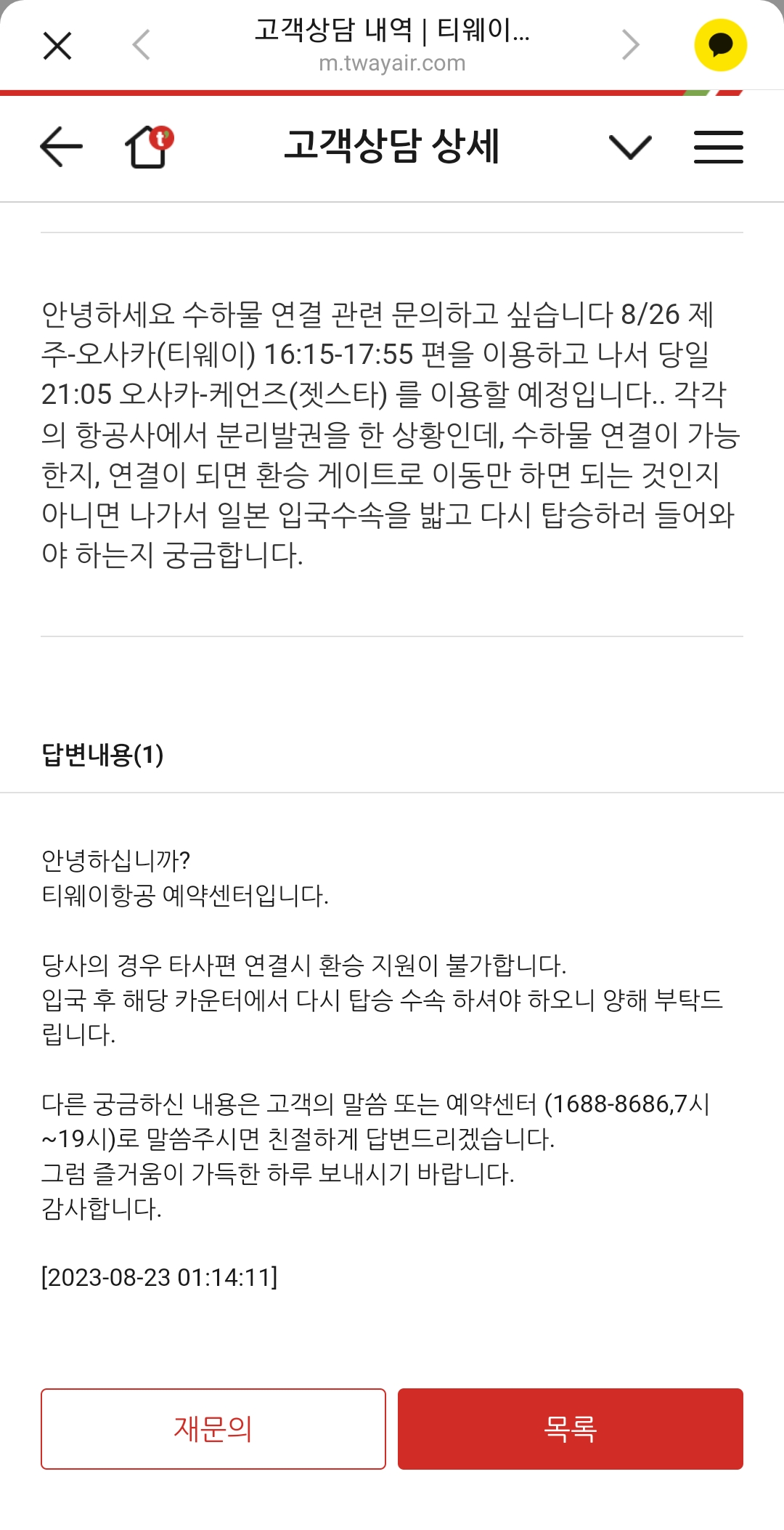 티웨이 후기는 없었음.. 그래서 직접 문의를 했다.