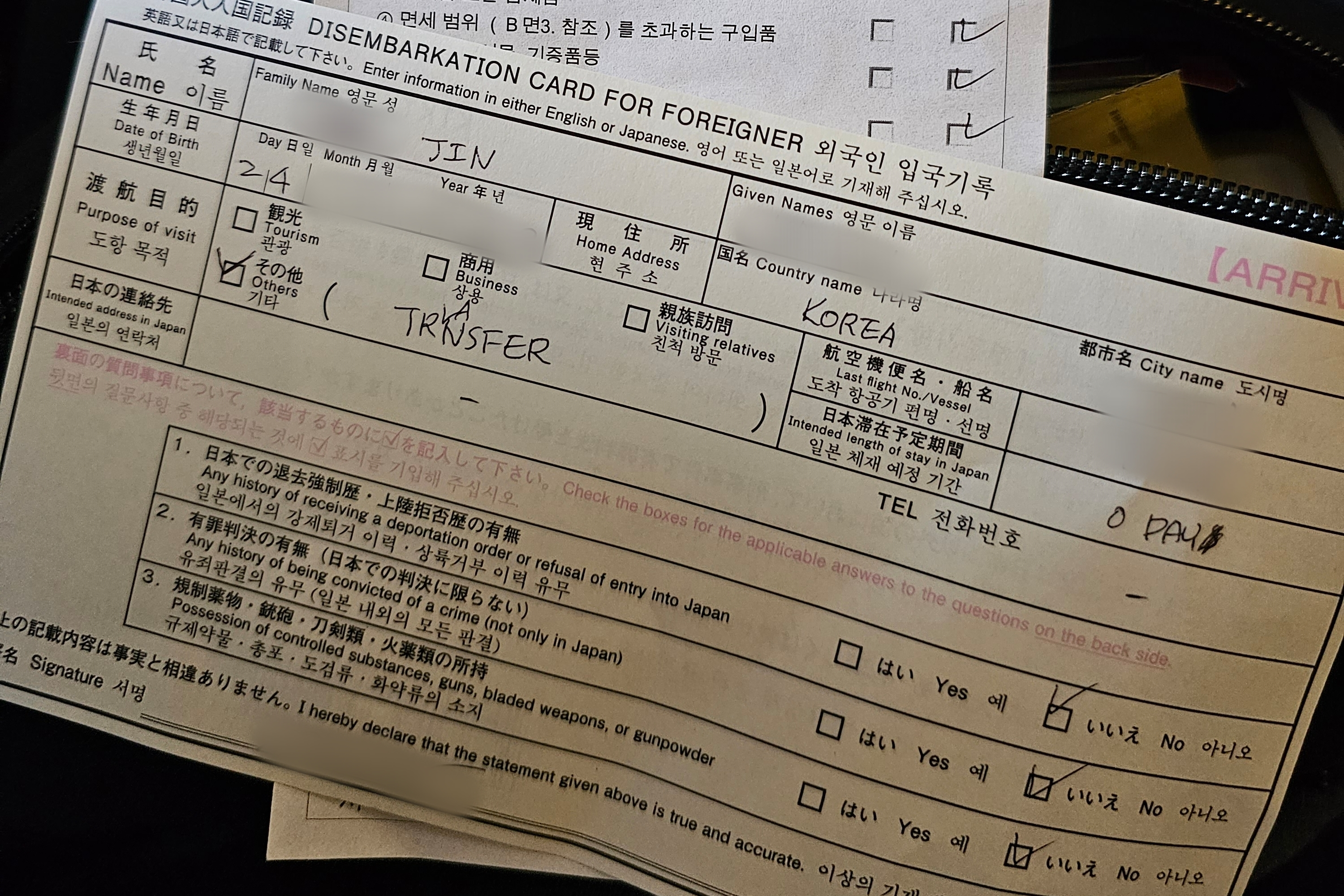 * 도항목적: TRANSFER, 체재기간 0 day