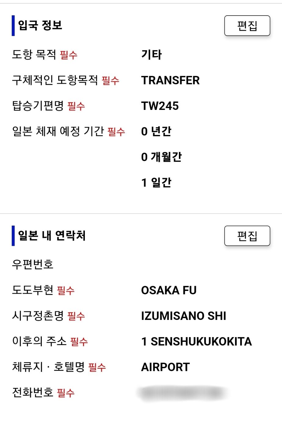 일본 내 주소는 구글에 뜨는 공항주소 써넣음ㅋㅋㅋ